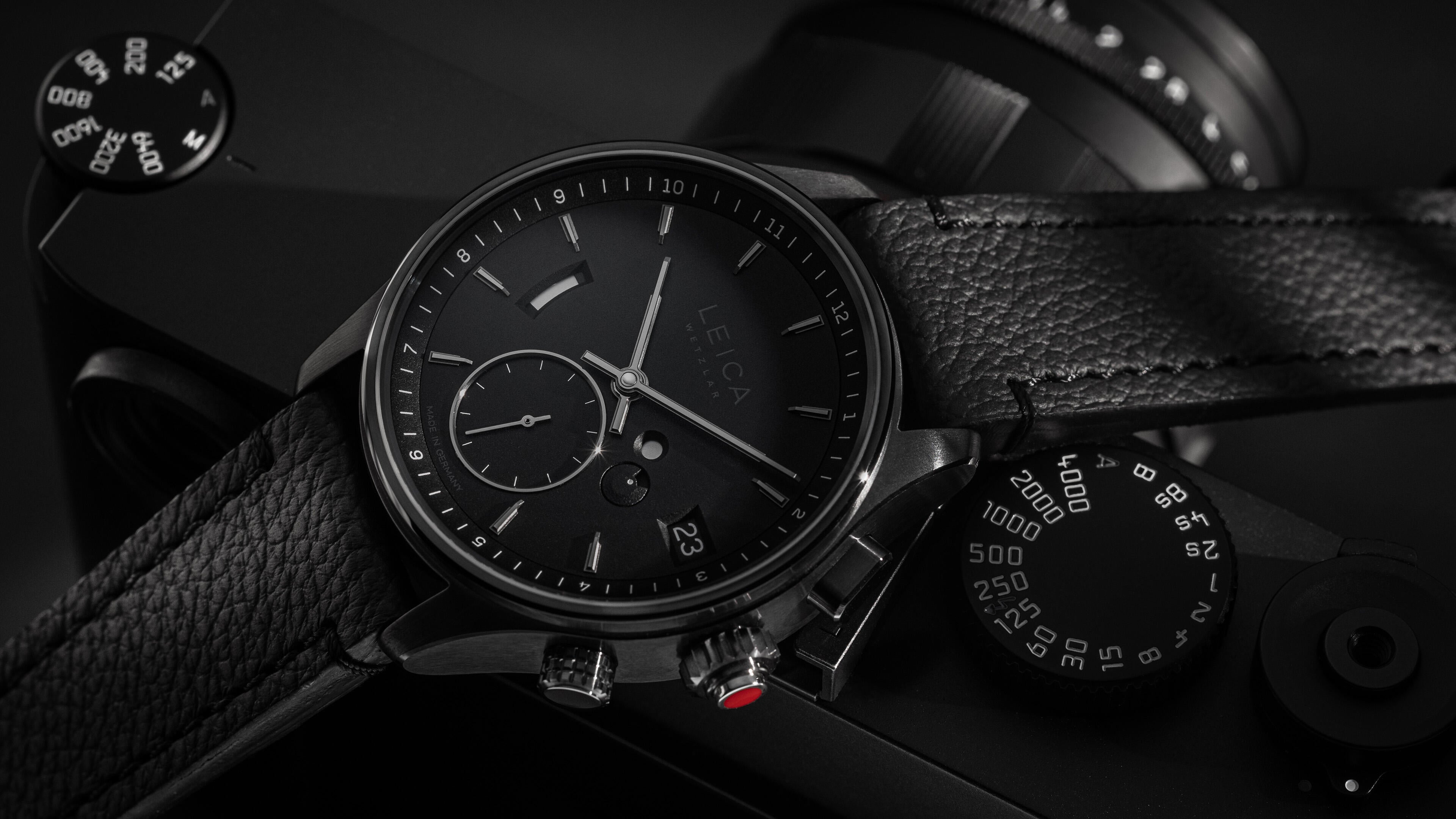 To complement the robust aesthetic of the ZM Monochrom, the timepieces’ black wristband is made of strong, full-grain veal leather, with a complimentary PVD coated buckle, echoing the leather covering of the Leica M11 Monochrom.